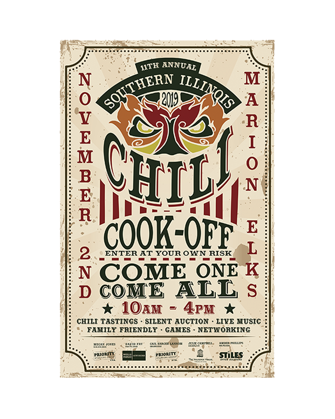 Every year in Marion there is a Chili cookoff held at the Elks Lodge to raise money for charity. I have been involved in creating the logo and other necessities for this event. This year they wanted a western style with a modern touch. Hit the nail on the head, dont ya think?